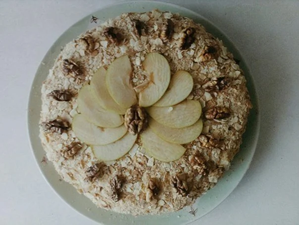 ШАГ 17 Когда торт пропитается, обрезаем неровные бока — придаем торту красивый вид. Толчем отложенные два коржа и посыпаем верх торта и бока. Украшаем как душе угодно: грецкими орехами, миндальными лепестками, тертым шоколадом или ягодами. Приятного аппетита!