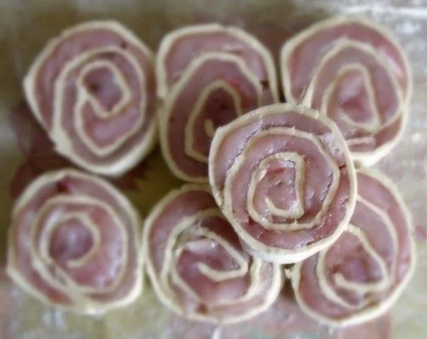 ШАГ 3 Тесто с грудками поплотнее свернуть рулетом и нарезать шайбами толщиной 1,5 см.