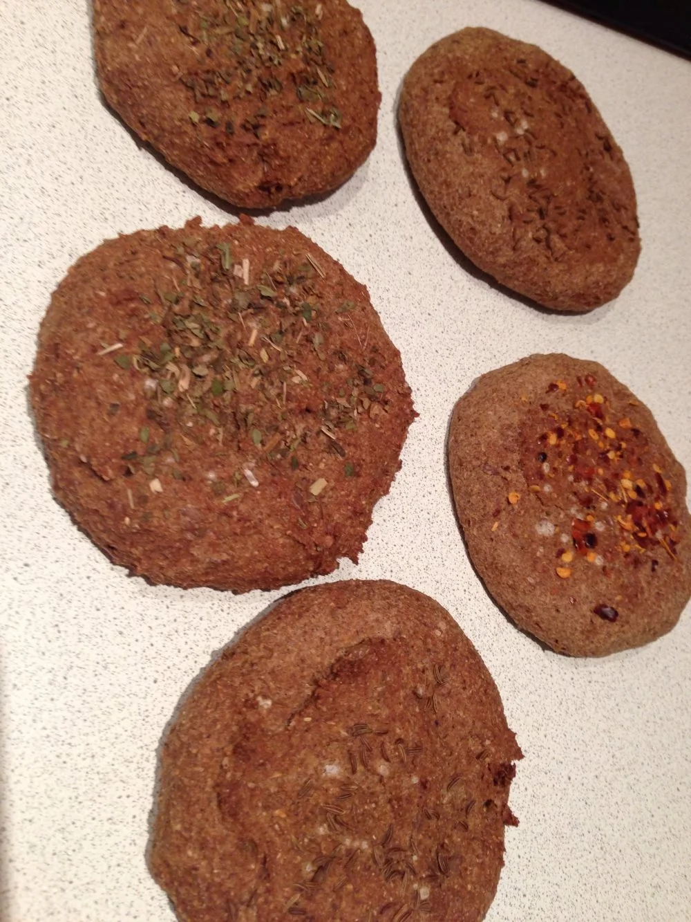 ШАГ 3 Руки смазать растительным маслом и выкладывать небольшие шарики на силиконовый коврик. Булочки приплюснуть и посыпать специями. Я использовала тмин, хлопья чили и сушеный базилик, а также морскую соль.