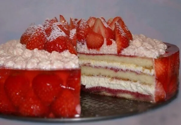 ШАГ 14 Теперь выкладываем второй ряд клубники (хвостиками вверх) в промежутки между ягодами нижнего слоя. Заливаем желе до верха торта. Ставим застывать.
