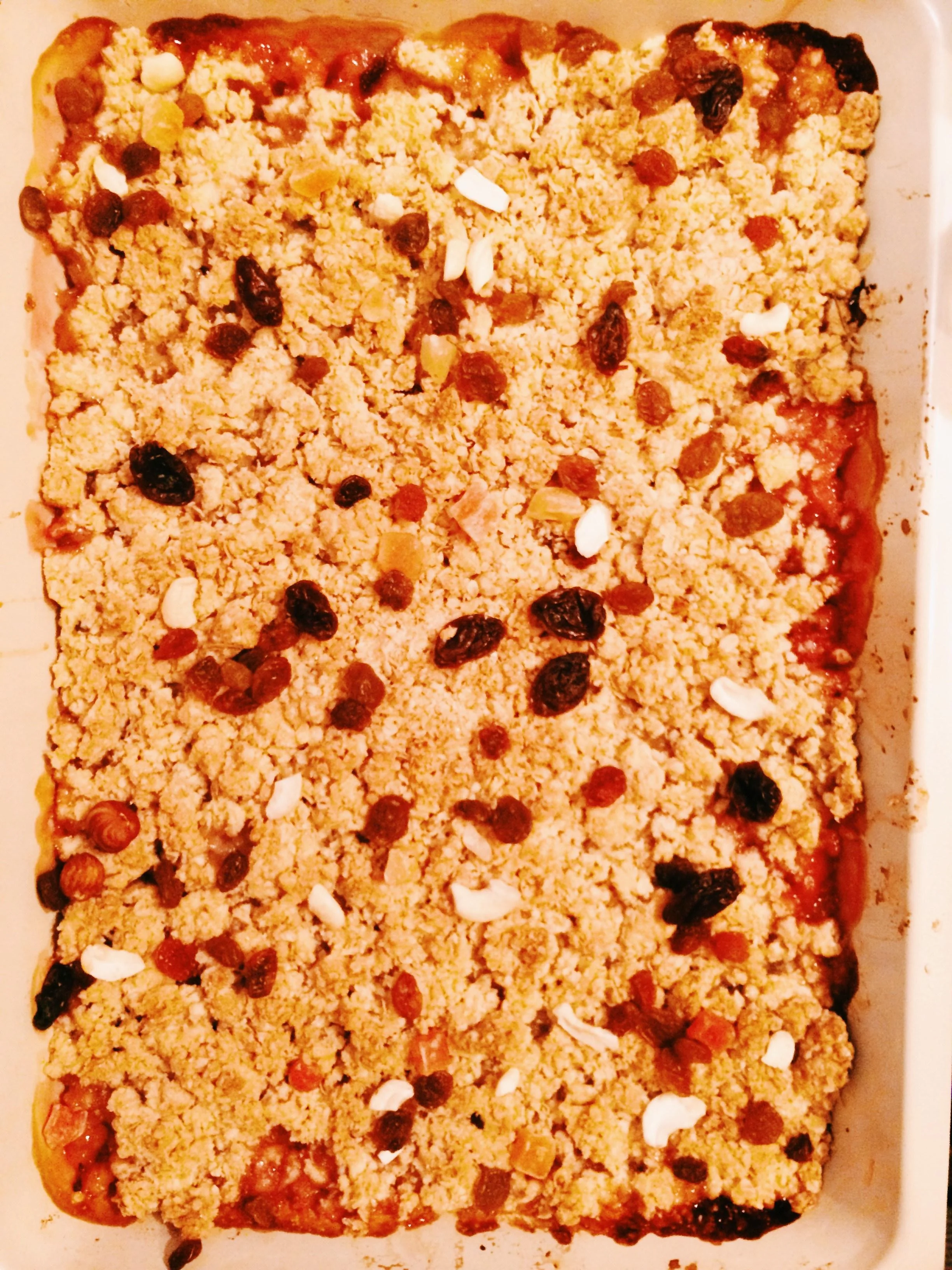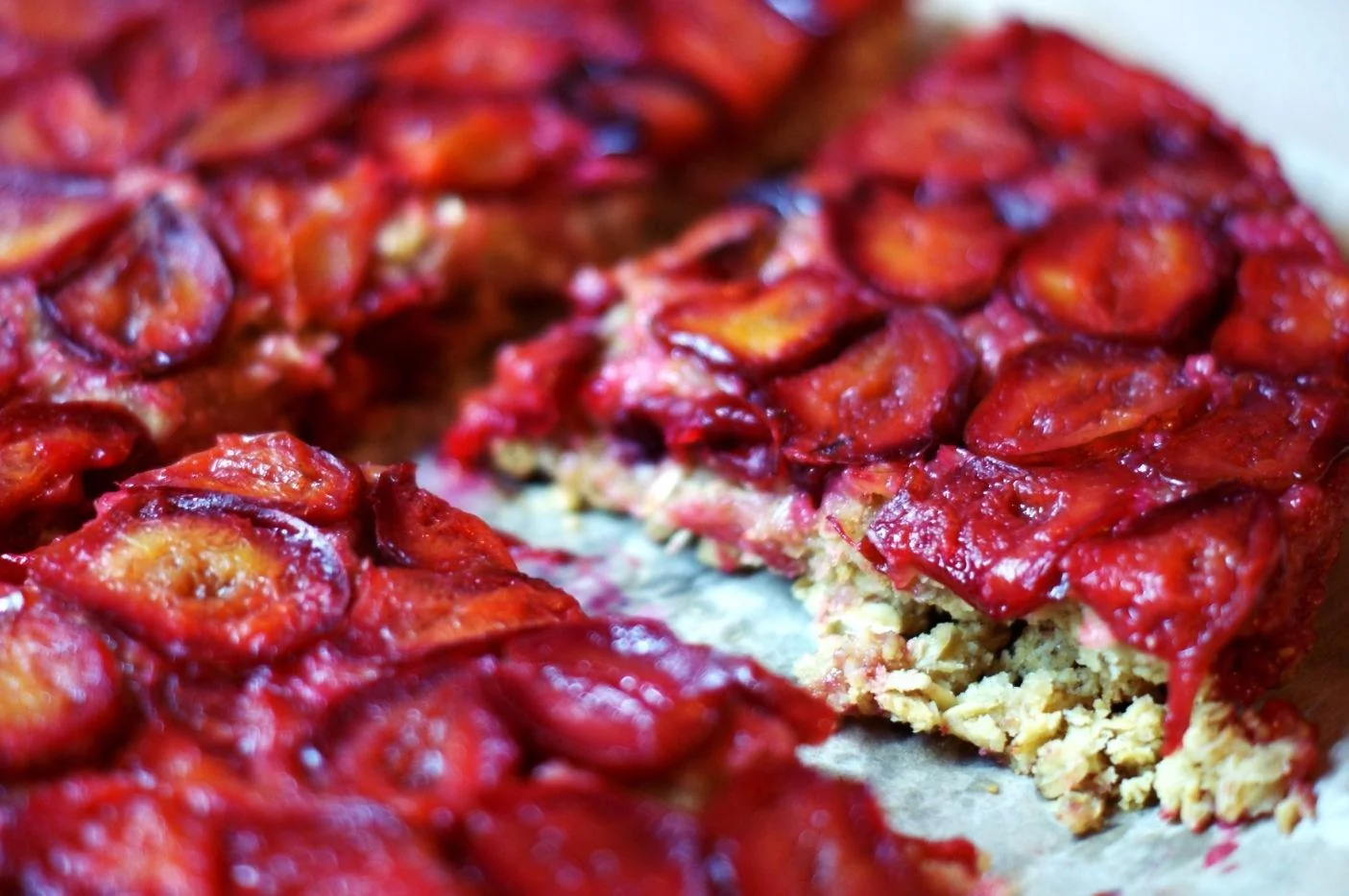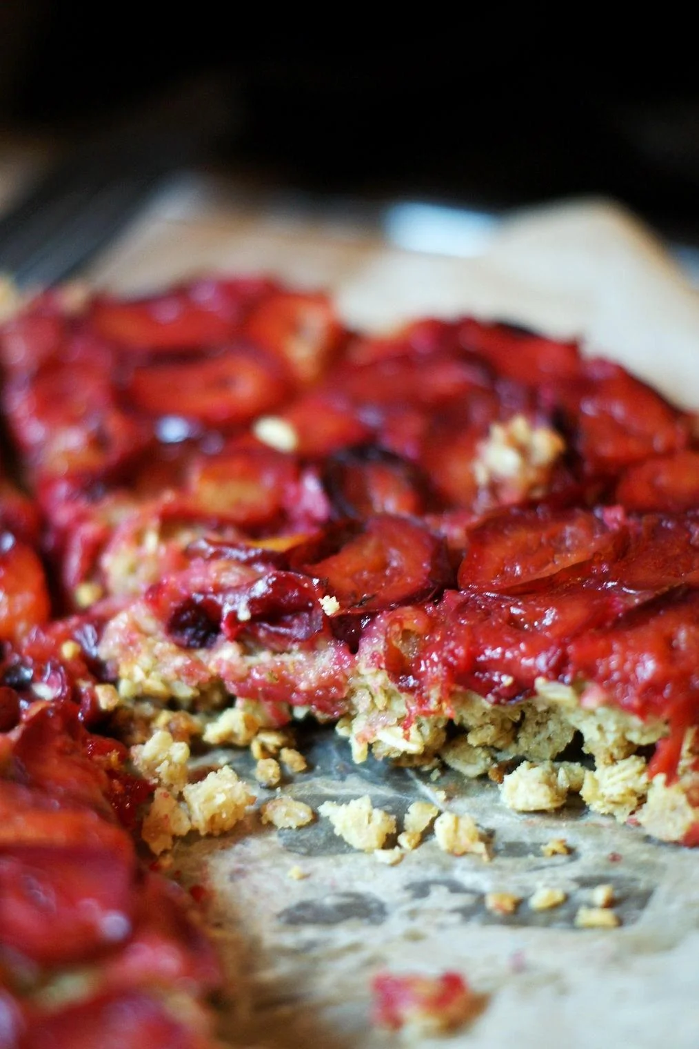 ШАГ 2 Порезать сливы пополам, вытащить косточки. Выложить в форму для выпекания, сбрызнуть кленовым сиропом. Сверху раскрошить приготовленное тесто. Запекать в духовке 30-40 минут, пока корочка не станет золотистого цвета, а фрукты не начнут пузыриться.