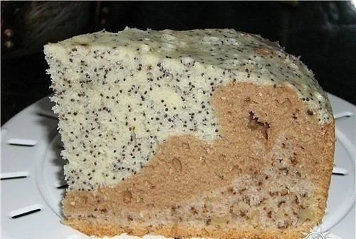 ШАГ 4 Форму смазать маслом. Первым выложить ореховый слой, вторым шоколадный, третьим маковый.