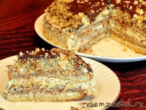 ШАГ 7 Сверху будет слой из крошки, который вы можете залить шоколадной глазурью или посыпать тертым шоколадом. Оставляем пропитываться на ночь. Торт получается очень нежным и вкусным. Готовьте и наслаждайтесь!