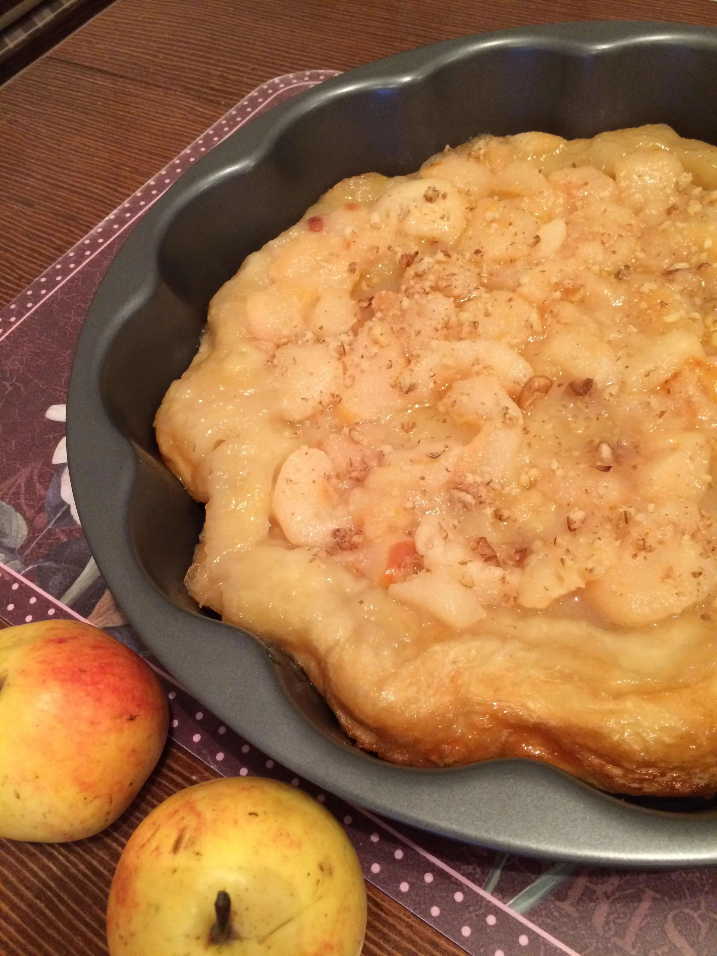 ШАГ 3 Тесто раскатать на 5 см больше, чем форма для выпечки, накрыть им груши, подоткнув со всех сторон. Проколоть несколько раз вилкой и запекать в течение 20–25 мин. до готовности. Дать остыть, перевернуть на блюдо грушами вверх, посыпать грецкими орехами. Подавать со сливками или мороженым.