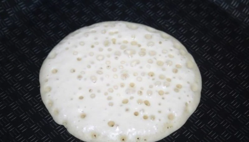 ШАГ 4 На сухую сковороду наливаем тонкой струйкой половину половника теста. Тесто начинает сильно пузыриться.