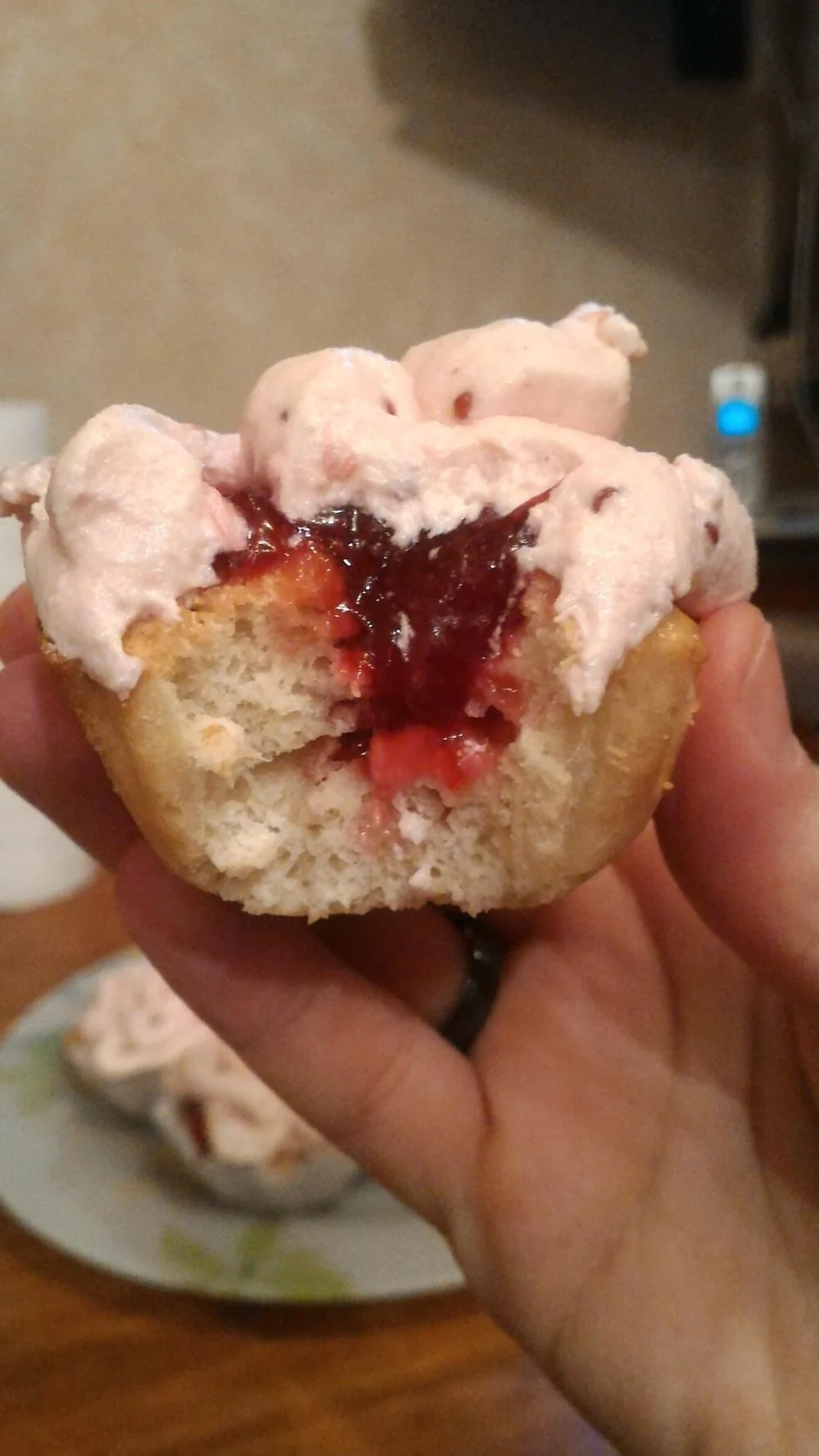 ШАГ 4 Готовые маффины извлечь из духовки, дать им остыть, вырезать середину из каждого маффина и заполнить начинкой.