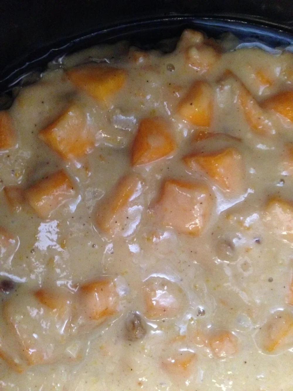 ШАГ 3 Из «лысого» апельсина выжать сок, добавить корицу, гвоздику, мёд. Смесь добавить к тыкве.