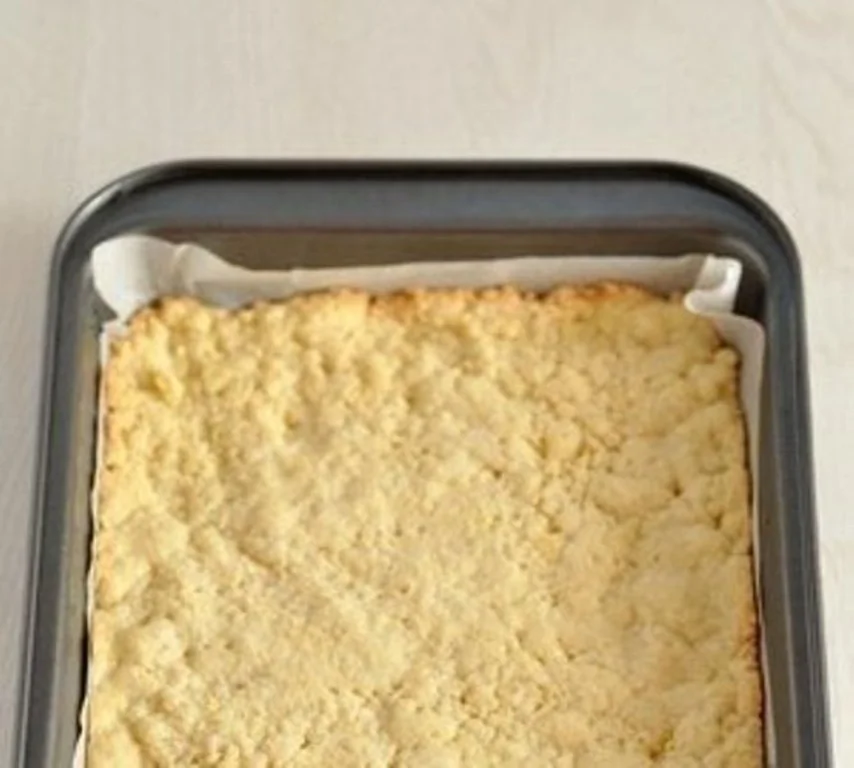ШАГ 3 Полученную из теста крошку выложить в застеленную пергаментом форму для запекания. Равномерно распределить тесто по форме, утрамбовать руками и наколоть вилкой. Убрать форму с тестом на 10 минут в морозилку или на 20-30 минут в холодильник.