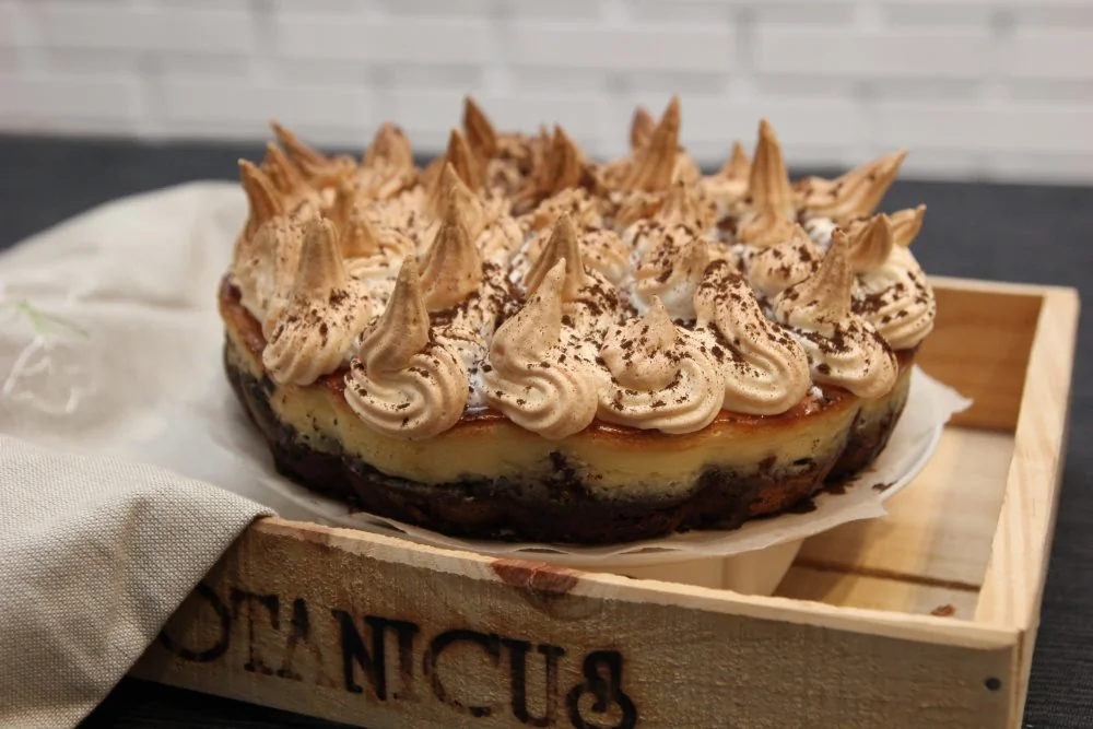 ШАГ 4 Высадить меренгу на готовый пирог из кондитерского мешка с круглой насадкой (если нет такой возможности, то можно просто распределить меренгу по поверхности пирога). Отправить пирог снова в духовку до того момента, когда меренга подрумянится. Готовый пирог можно присыпать какао по желанию.