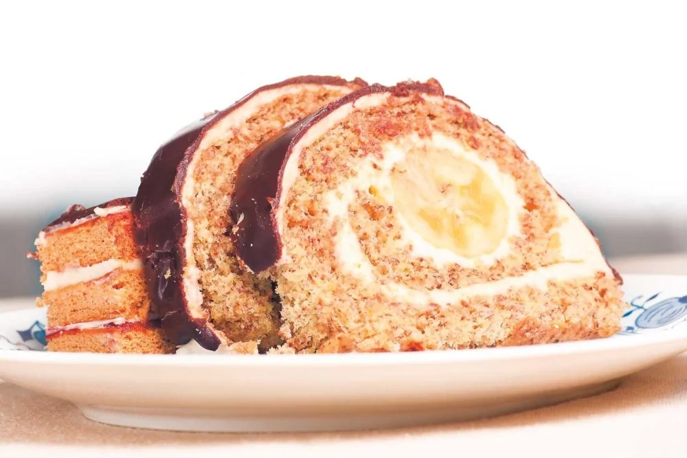 ШАГ 5 Уложить на них нарезанный тонкими дольками банан. Плотно свернуть рулет. Сверху смазать рулет сахарным сиропом, посыпать пудрой и тертым шоколадом. По желанию украсить ягодами или цукатами.