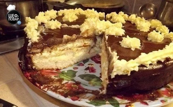 ШАГ 7 Готовый корж разрезаем вдоль на две половинки. На одну половинку коржа выкладываем весь крем и выравниваем его ножом. Наверх кладем вторую часть коржа и щедро поливаем все шоколадной глазурью.