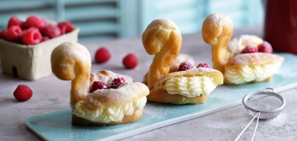 ШАГ 3 Малину или другие ягоды аккуратно вымойте и просушите. Сливочное масло комнатной температуры взбить при помощи ручного миксера с сахарной пудрой. Постепенно, по 1 столовой ложке, введите в масло охлаждённый пудинг и продолжайте взбивать крем. Готовый крем переложите в в кондитерский мешок с наконечником звезды. Отсадите крем в каждую половинку эклера. Вставьте в крем крылья и шеи, а затем украсьте малиной каждого лебедя. Подавайте пирожные сразу же на праздничный стол.