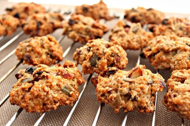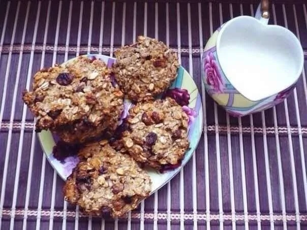 ШАГ 1 Смешать в одной чаше овсяные хлопья: лучше использовать мелкий помол для быстрого приготовления, так тесто получится более однородное, но если вы делаете энергетическое печенье с большим содержанием клетчатки, то берите крупные хлопья. Добавить к хлопьям рубленые орехи, корицу, сахар, изюм, разрыхлитель и соль. Орехи выбирайте по своему вкусу. Отдельно смешать нарезанный маленькими кусочками банан, протертые на крупной терке яблоко и морковь, сюда же добавить оливковое масло и обязательно теплую кипяченую воду. Теперь пора соединить обе смеси. Хорошенько вымешать. Дать тесту отдохнуть 15 минут.