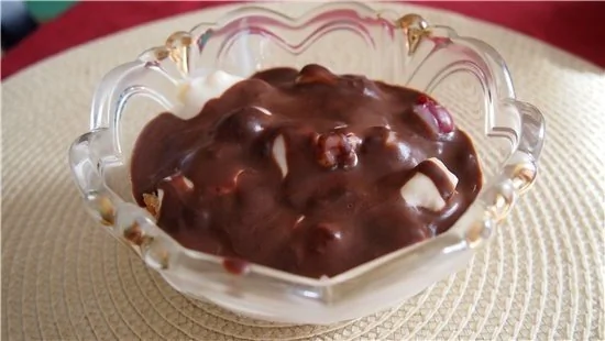 ШАГ 6 Положите в кастрюлю с толстым дном кусочки шоколада и нагревать при постоянном помешивании до тех пор, пока шоколад полностью не растает, добавить масло, чтоб тоже растаяло.
