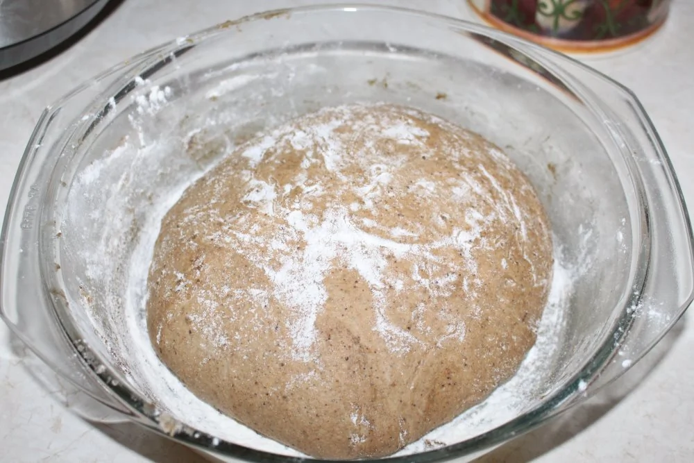 ШАГ 6 Тесто увеличится в размере раза в полтора. Месим тесто еще раз. Присыпаем мукой сверху и на присыпанную мукой поверхность кладем наш шар. Оставляем в теплом месте на 2 часа.