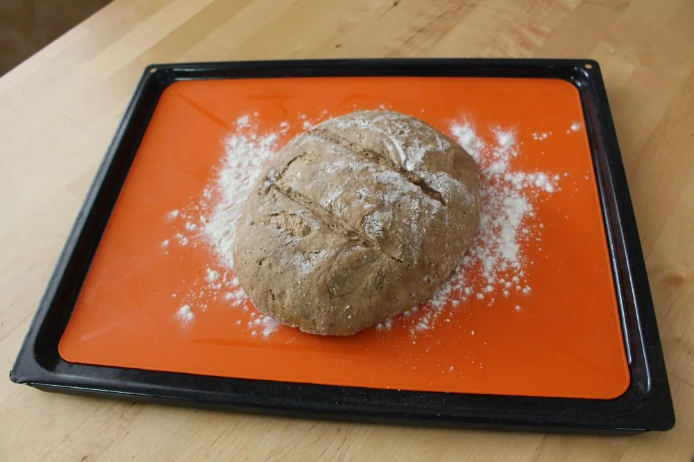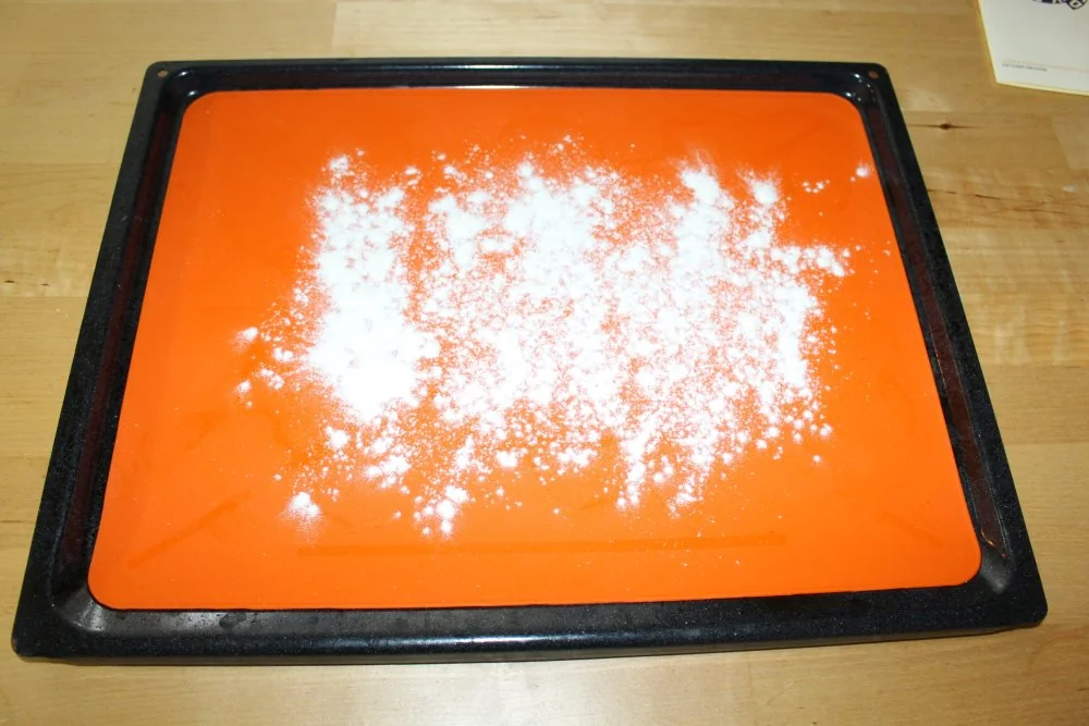ШАГ 9 Выкладываем тесто на лист, смазанный маслом и присыпанный мукой. Я использую силиконовый коврик, присыпая его пшеничной мукой.