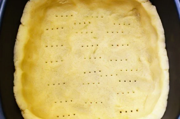 ШАГ 2 Песочное тесто (замешиваем по этому рецепту, используя вдвое меньше ингредиентов: мука — 125 г, желток — 1 шт., сливочное масло комнатной температуры — 50 г, вода — 20 мл, сахар — 40 г, ванильный экстракт — 5 мл, щепотка соли) распределяем по форме для выпечки в мультипечи, бортики делаем как можно выше. Накалываем вилкой и отправляем выпекаться в мультипечь при 180 C около 10 минут. Чтобы было легче доставать, можно проложить форму пергаментом.