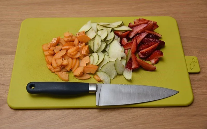 ШАГ 3 Разрежьте мушмулу и грушу на половинки, удалите косточки, мякоть порежьте тонкими пластинками, клубнику порежьте дольками.
