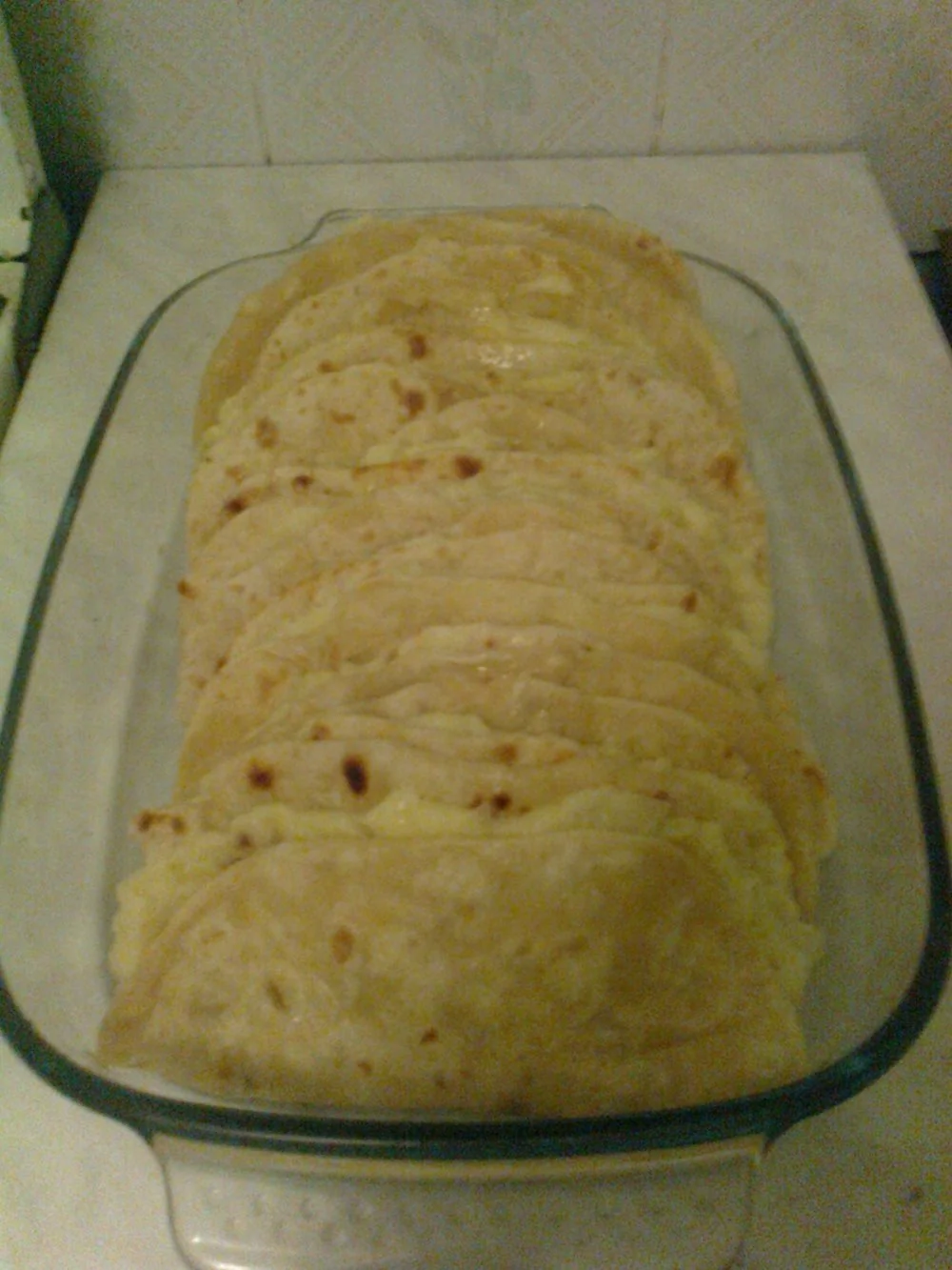 ШАГ 10 Затем начинку укладываем на одну половину лепешки и прикрываем второй. Так проделываем со всеми. Укладываем в форму, сверху накрываем пленкой или полотенцем.