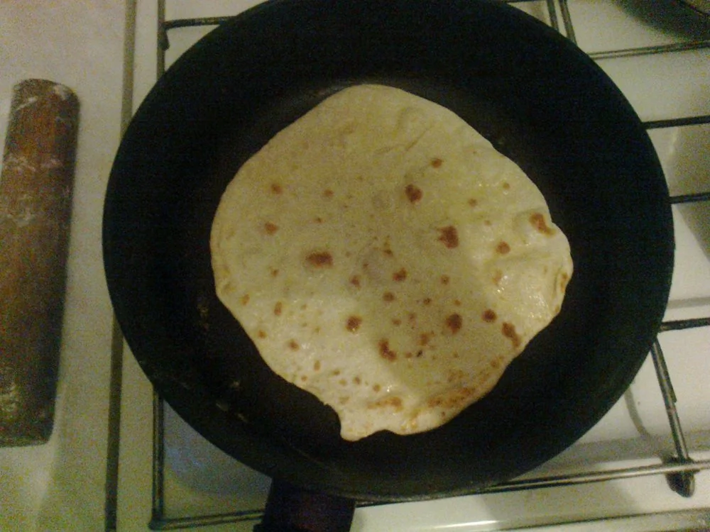 ШАГ 8 Обжариваем лепешку сначала с одной стороны, потом переворачиваем и смазываем сливочным маслом (кисточкой или вилкой), жарим до готовности (когда она слегка подрумянится, по готовности тесто изменит цвет). Следим, чтобы снизу не подгорало.