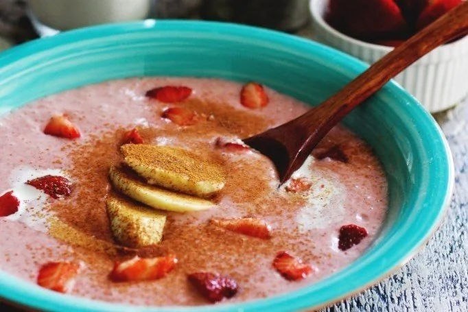 Охладить в холодильнике пару часов и разлить в тарелку. По желанию украсить клубникой, бананом, корицей, мятой.