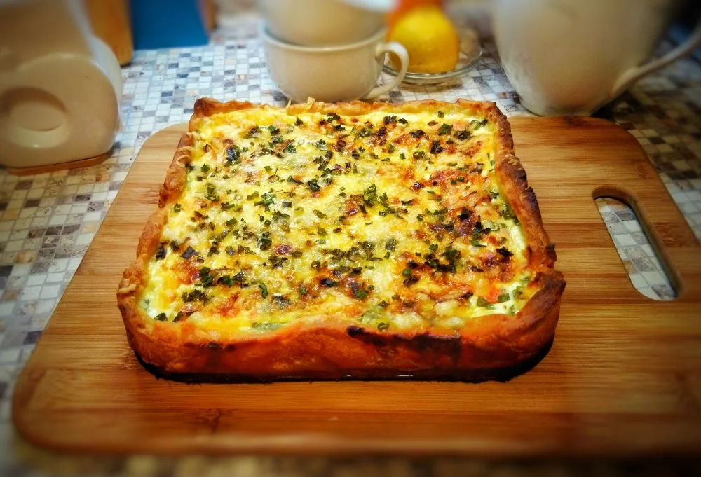 ШАГ 8 Когда пирог будет практически готов и начинка застынет, посыпать сверху оставшимся сыром и запекать под грилем или просто так до образования корочки.