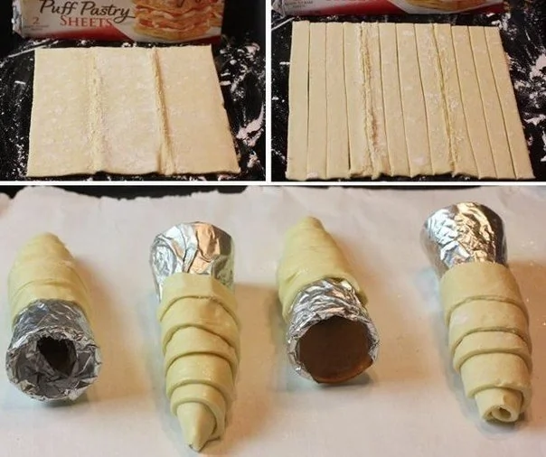 ШАГ 3 Обернуть каждую полоску вокруг своей трубочки, начиная от узкого конца трубочки и положить швом вниз на смазанный противень.