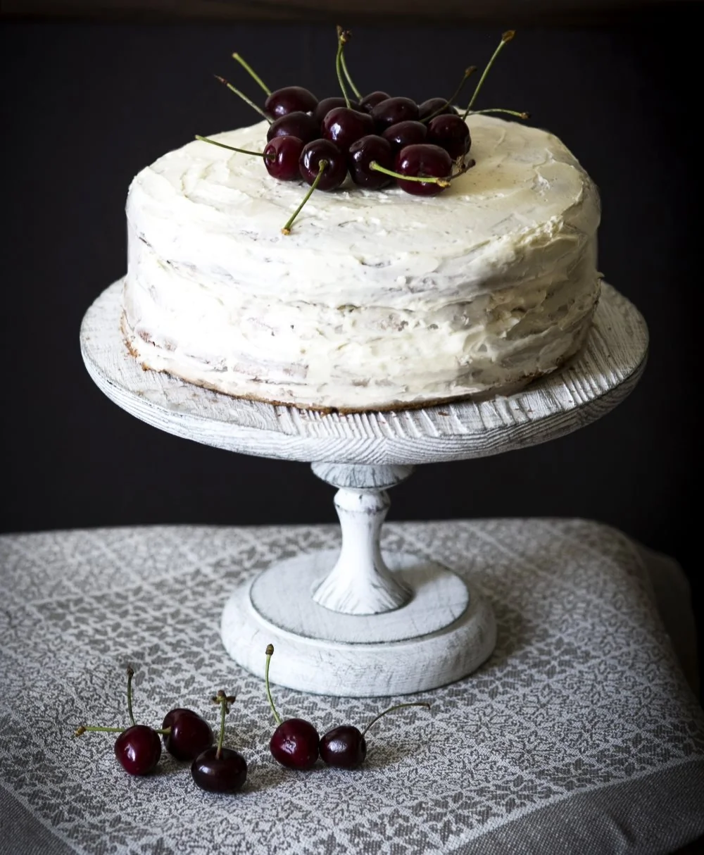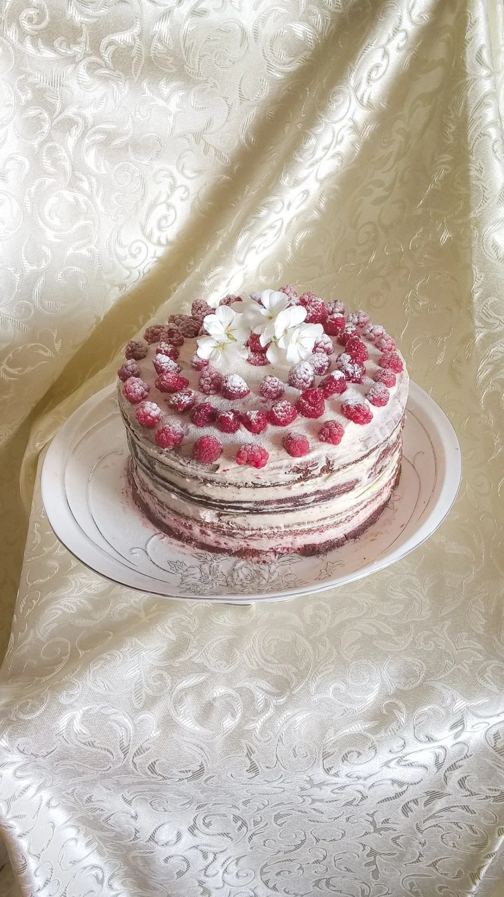 ШАГ 11 Выложить крем на корж, пропитанный сиропом, сверху крема выложить малину, дальше снова корж, крем, малину. Последний корж смазать кремом и украсить малиной.