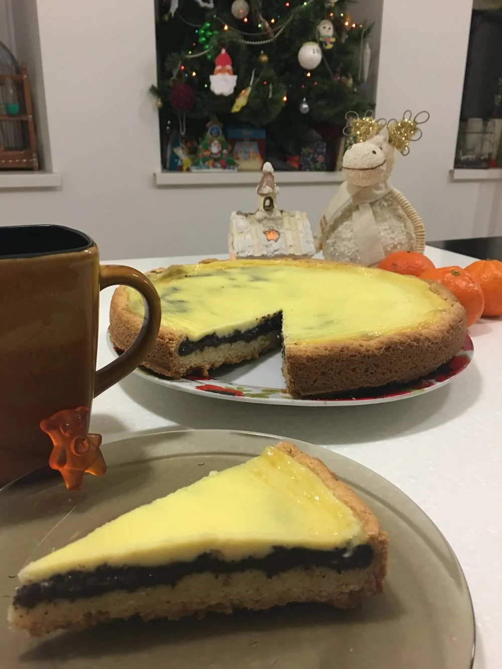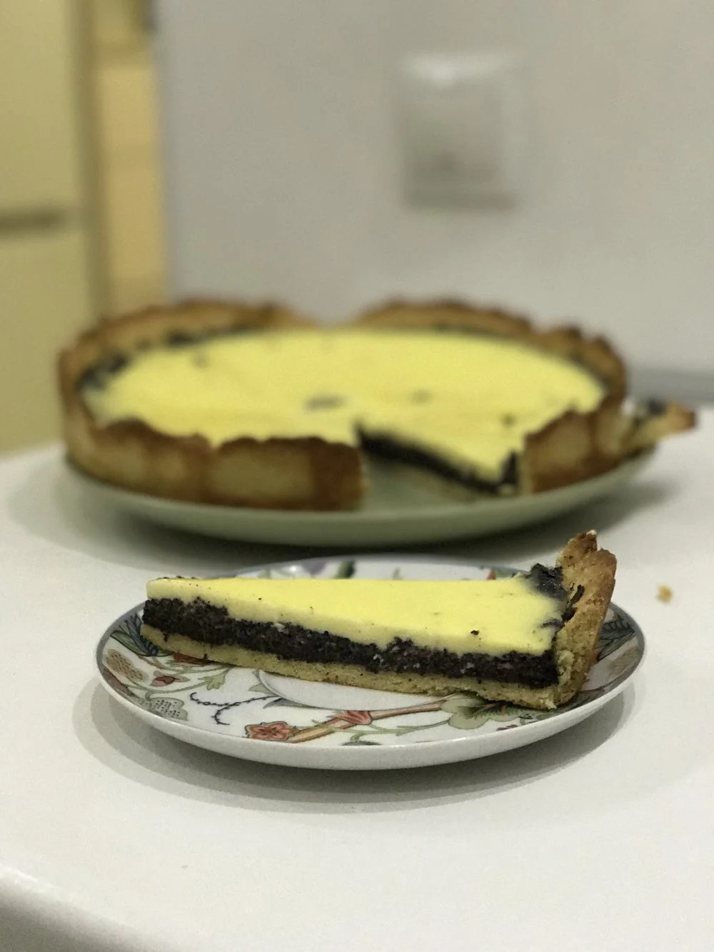 ШАГ 5 Далее достаем нашу основу и выкладываем начинку. Сначала маковый слой,затем заливаем сметанным. И в духовку на 180 градусов на 30-35 минут.