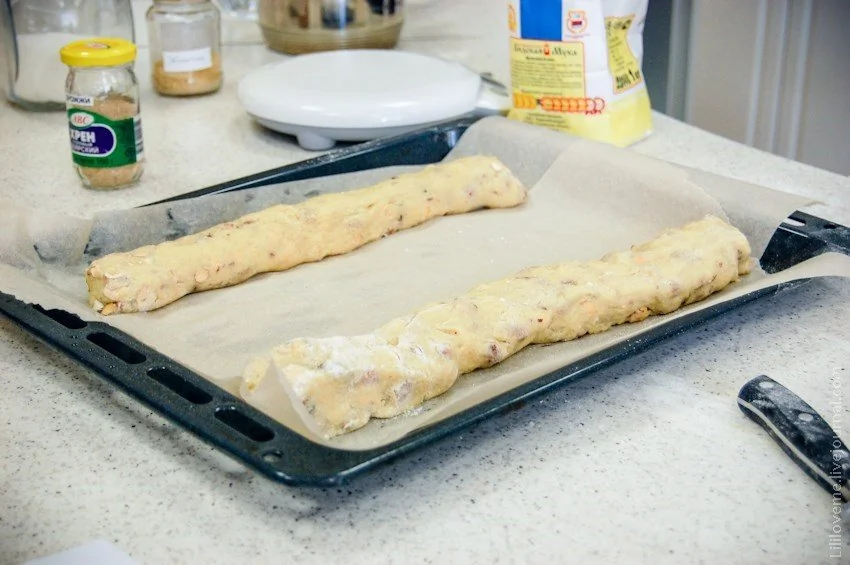 ШАГ 5 Нарезать на кусочки 1 см, выложить на противень и подсушить в духовке до образования твердых сухариков.