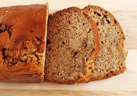 ШАГ 4 Добавить пюре из бананов (лучше использовать перезрелые), затем всыпать просеянные сухие ингредиенты вместе с порезанными грецкими орехами, по трети за раз. Перемешивать до однородного состояния. Влить смесь в форму для хлеба и поставить на противень. Запекать в центре духовки 55 минут, пока хлеб не станет твердым на ощупь, но сочным внутри.