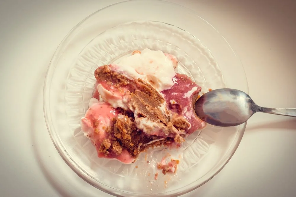 ШАГ 6 Гороховое тесто выложить в контейнер. Сверху полить клубничным пюре и украсить кокосовой стружкой. При желании можно украсить взбитым творогом или сливками. Отправить в холодильник на несколько часов для хорошего застывания.