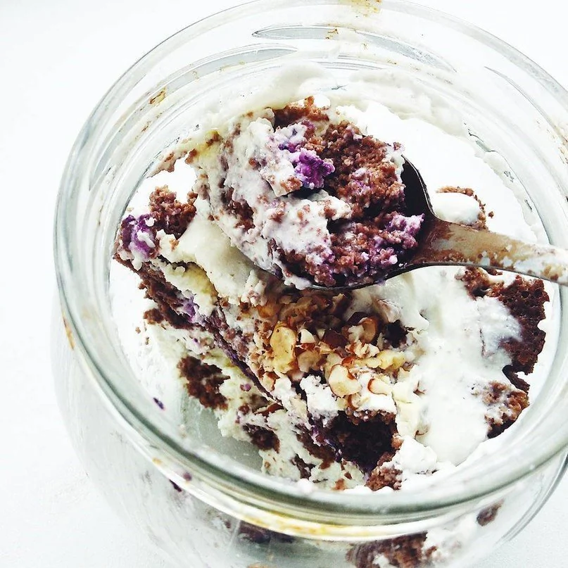 Творожно-бисквитный слоёный десерт с черникой и орехами