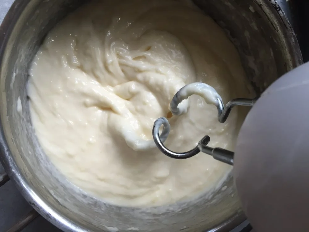 ШАГ 2 Молоко и растительное масло доводим на среднем огне до кипения. Снимаем с огня. Вмешаем тапиоковый крахмал, работать нужно быстро. Продолжаем вымешивать миксером с насадками для теста 2-3 минуты на низкой скорости до тех пор, пока оно станет гладким и начнет формироваться шар.