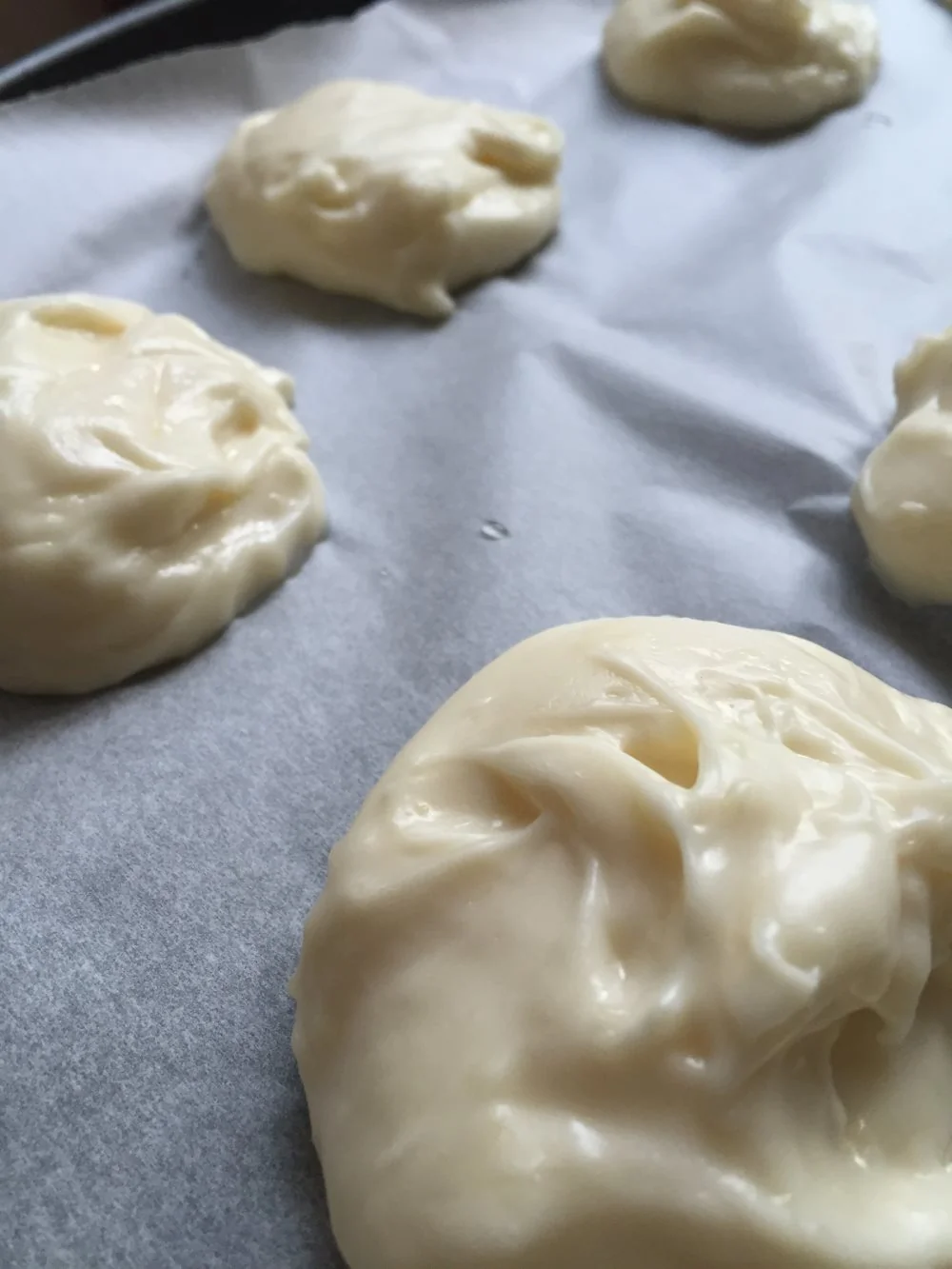 ШАГ 4 Противень проложить бумагой для запекания. Смоченной в холодной воде ложкой для мороженого выложить 12 булочек, оставляя между ними около 3-х см, потому что тесто будет подниматься.
