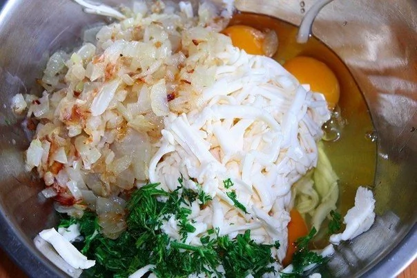 ШАГ 4 Для начинки смешайте яйца, лук и потертый на крупной тёрке плавленный сыр. Добавьте зелень и немного соли. Остальные специи добавьте по вкусу.