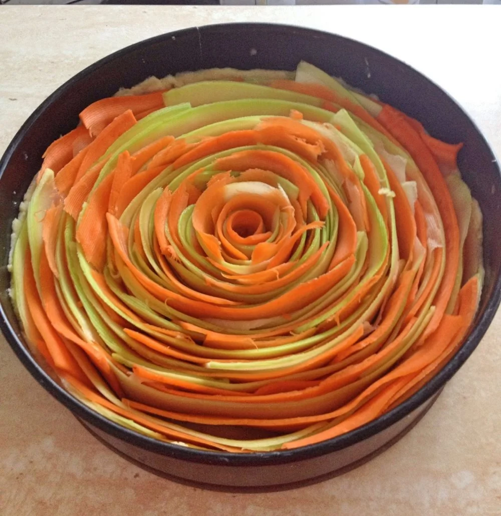 ШАГ 5 Вынимаем тарт из холодильника, выкладываем по очереди от краев тарта к центру ломтики моркови и цукини (как на фото). Убираем в холодильник на время приготовления соуса.