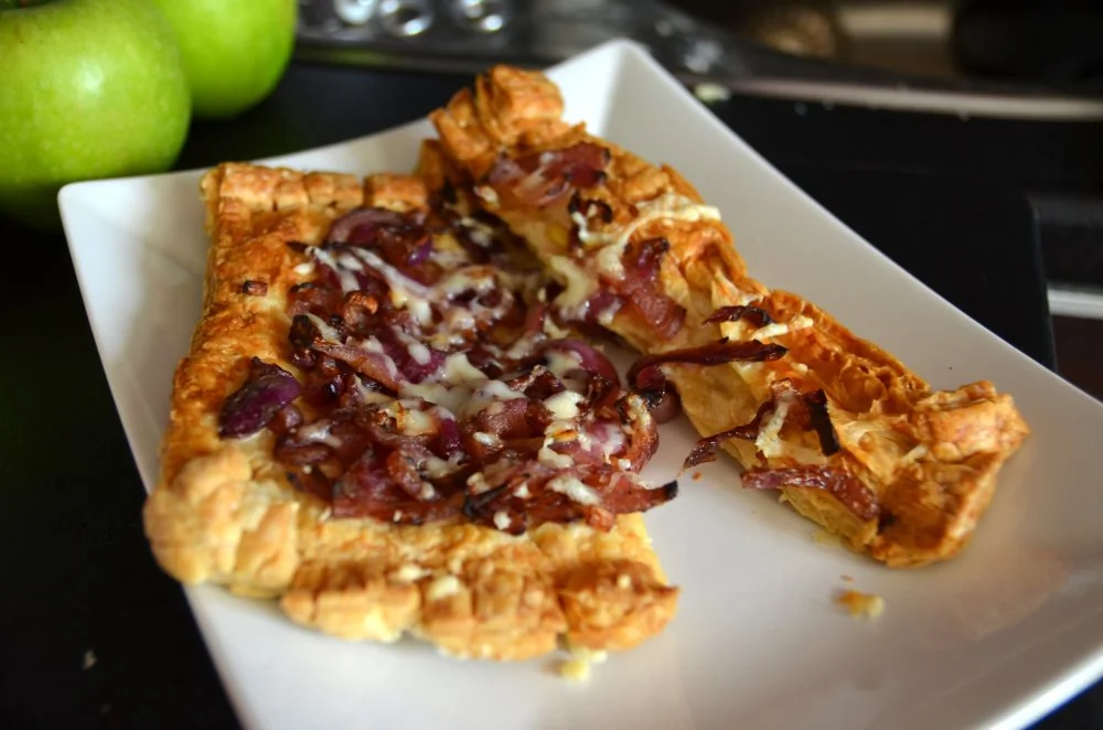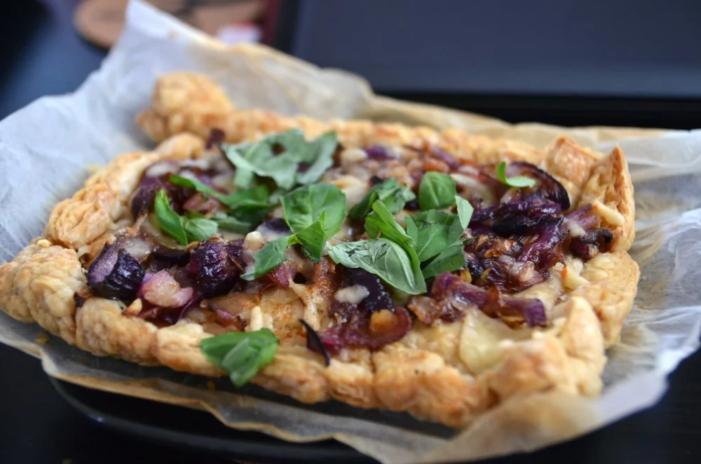Пирог из слоеного теста с карамелизованным луком и сыром