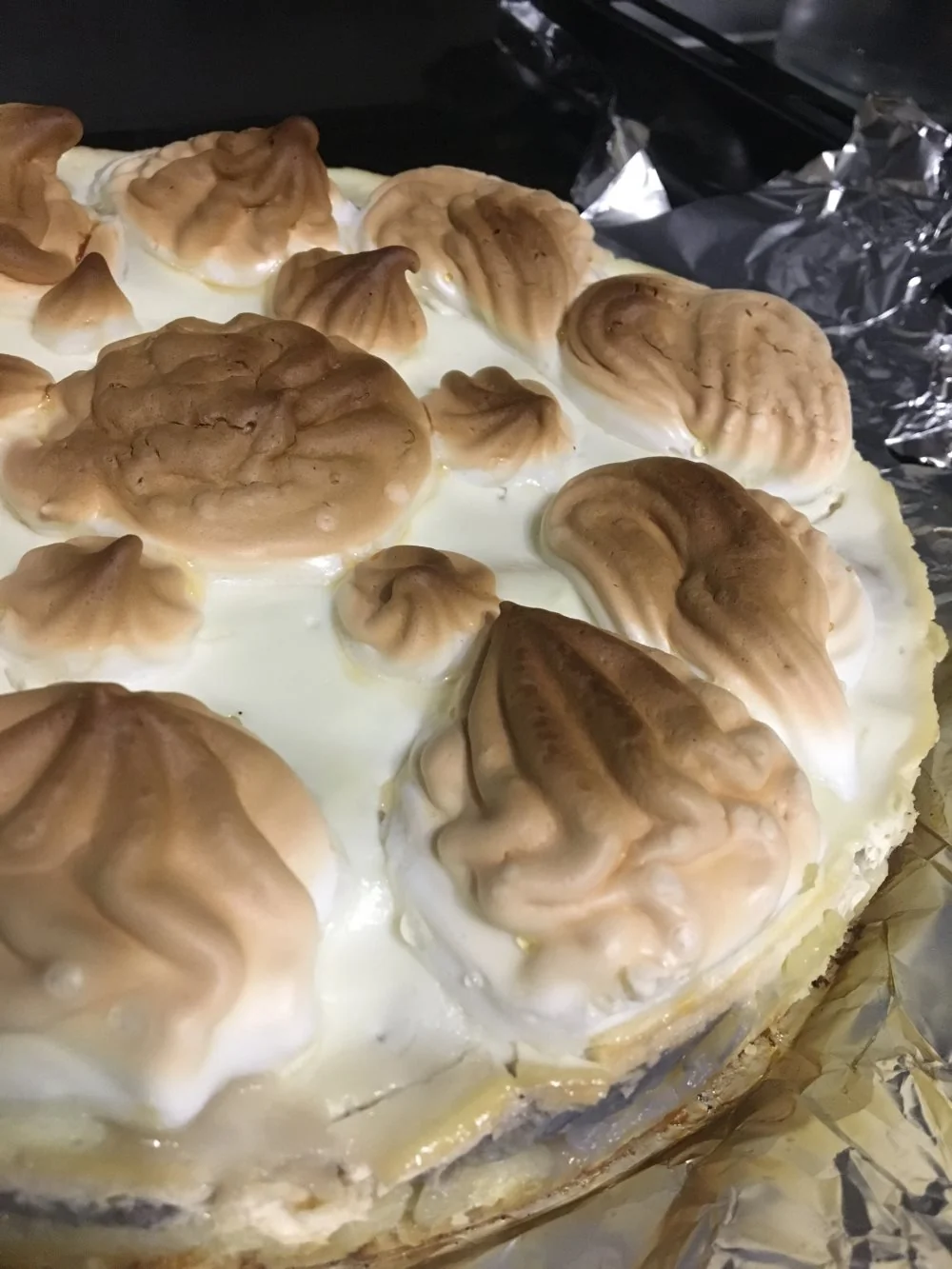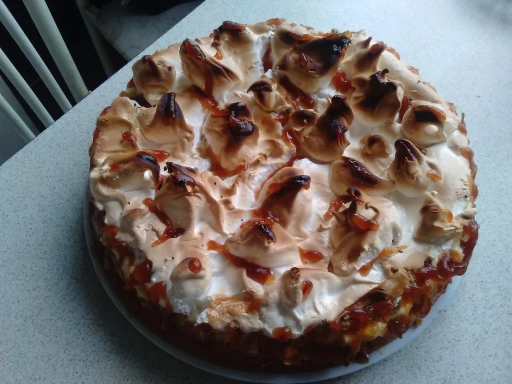 ШАГ 7 Достаём наш тортик из духовки и аккуратно, выкладываем на него пышный белок. Можно сделать рисунок или горочки. Если есть кондитерский мешок, делайте свои шедевры :)))