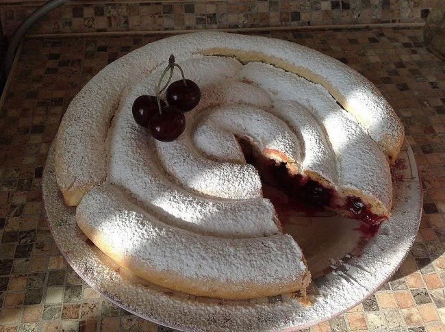 ШАГ 3 Уложить начиненные вишней колбаски спиралью в форму и выпекать при 200 градусах до румяного цвета примерно 30-40 минут.