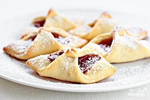 ШАГ 2 Руками замешивать тесто до тех пор, пока оно не перестанет липнуть к рукам, сформировать из него шар. Раскатать тесто на слегка присыпанной мукой поверхности в пласт толщиной 3 мм. Вырезать из теста квадратики размером примерно 6х6 см. В центр каждого квадратика положить по чайной ложке варенья или джема. Аккуратненько защипать два противоположных уголка квадратика, формируя что-то наподобие бабочки. То же самое проделать с оставшимися квадратиками теста.