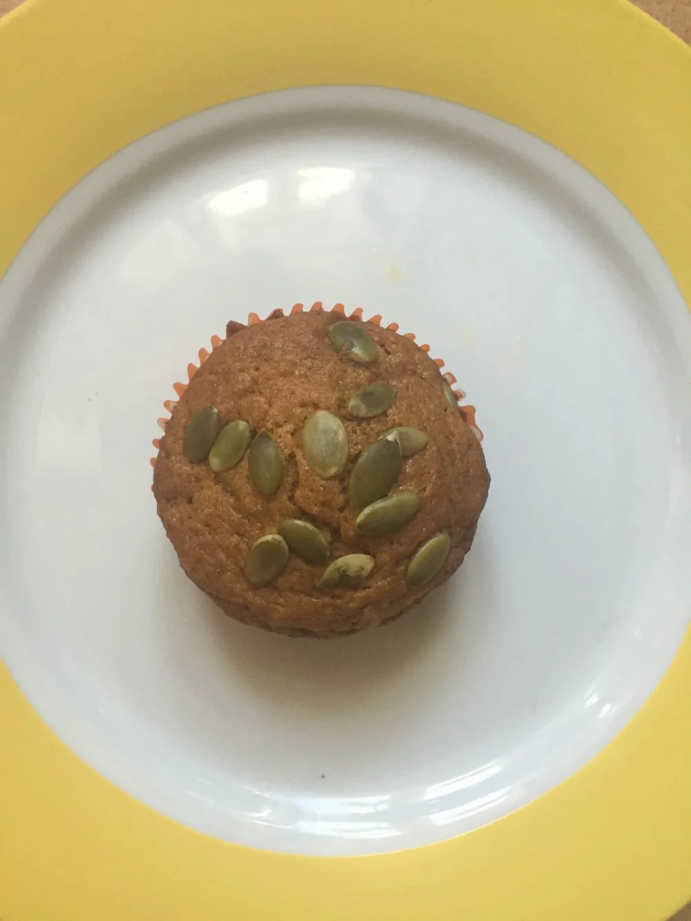 ШАГ 6 Выкладываем тесто большой ложкой в формы не доходя до края около 1 см. Украшаем верх маффинов тыквенными семечками.