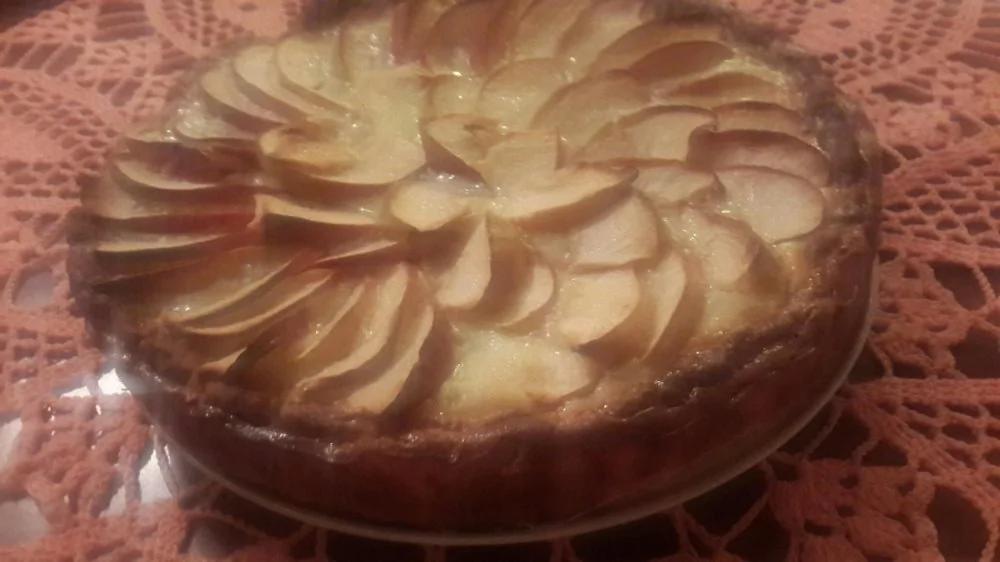 ШАГ 5 На готовое тесто выложить красиво тонко нарезанные дольки яблок, залить их кремом и выпекать еще 40–50 минут при температуре 200 градусов!