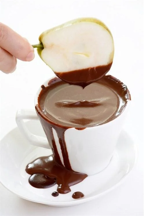 ШАГ 1 Шоколад поломать на небольшие куски и растопить в горячем кофе, постоянно помешивая. Добавить сливки, коньяк и корицу, растопить до однородной массы, держать над горелкой. Макать зефир или кусочки персика.