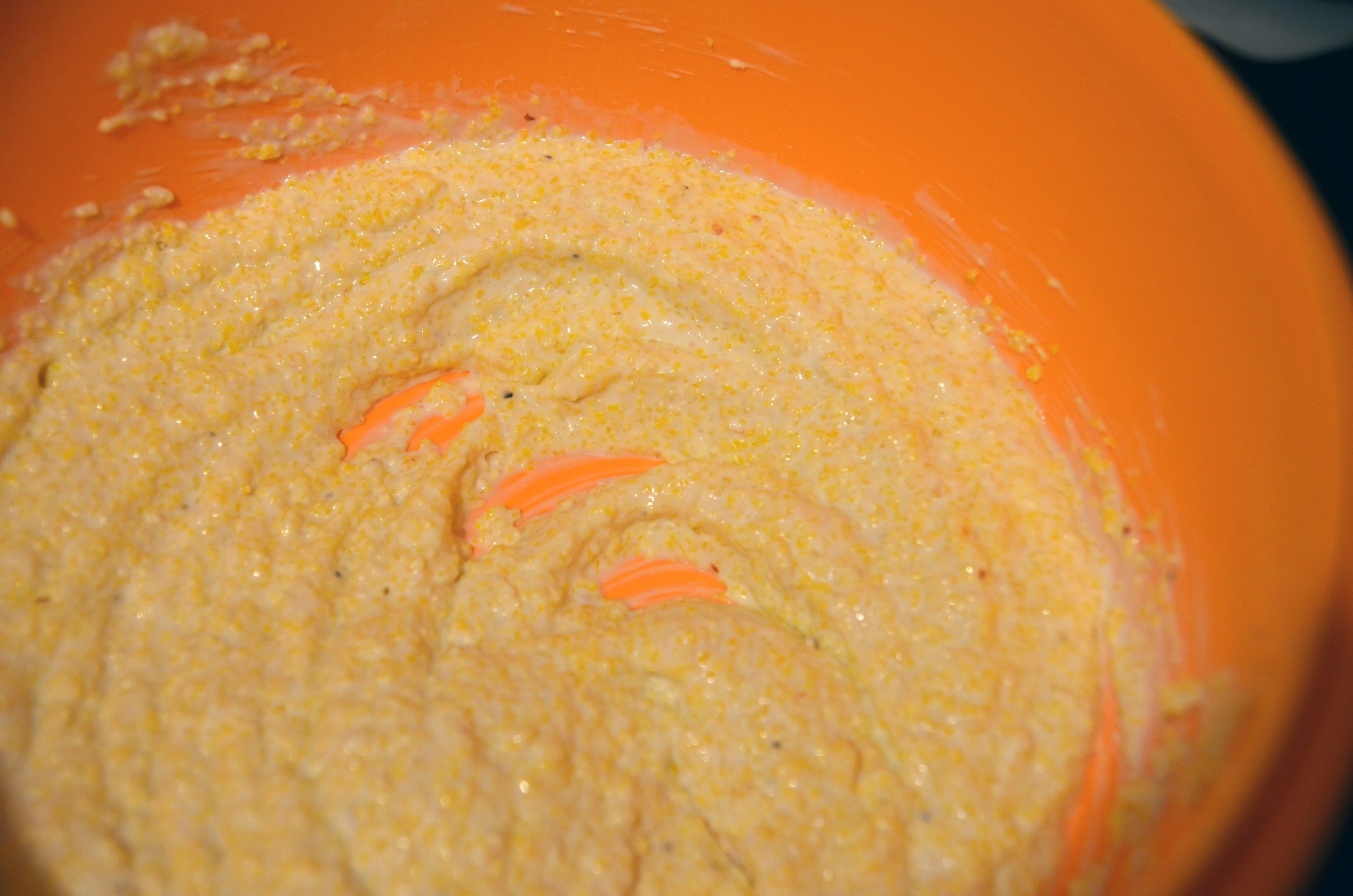 ШАГ 2 Масло растереть с сахаром, добавить яйцо, хорошо перемешать, затем добавить муку, перемешать, чтобы не было комочков, после чего всыпать стакан кукурузной крупы, добавить 70 мл воды или молока, хорошо перемешать. Это будет похоже на обычную густую кукурузную кашу. Если масса будет очень густая, долить ещё немного жидкости. Оставить настаиваться, пока вы делаете следующий шаг.