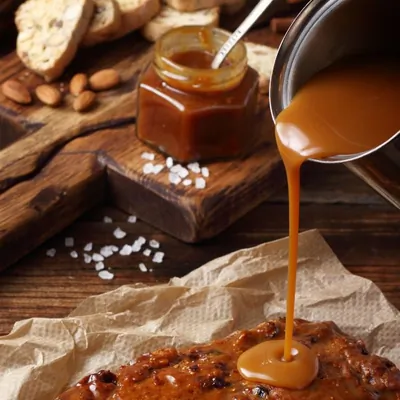 ШАГ 4 В сахар коньячного цвета добавьте масло и горячие сливки. Хорошенько помешайте 1 минуту.