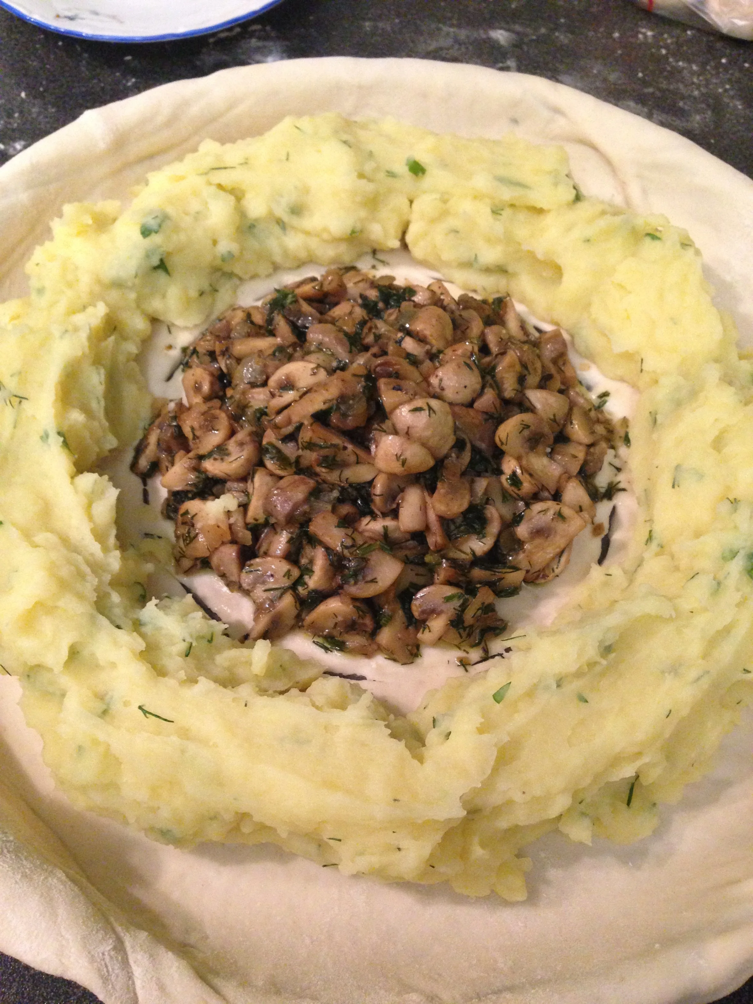 ШАГ 5 Примерно намечаем блюдцем малого диаметра центр пирога, делаем легкие надсечки ножом, чтобы зрительно ориентироваться, и в этот центр полукругом выкладываем грибы. Чуточку отступаем и вокруг грибов выкладываем пюре. По желанию,можно всю начинку перемешать. Затем делаем такой же пласт теста но на 1.5 - 2 см больше предыдущего. Так же определяем центр с помощью маленько блюдца. И делаем сквозные надсечки в виде решетки. Далее на этом пласте делаем 7 разрезов от каждого края к границе центра, это необходимо для того, чтобы когда мы будем накрывать пирог, не было складок.