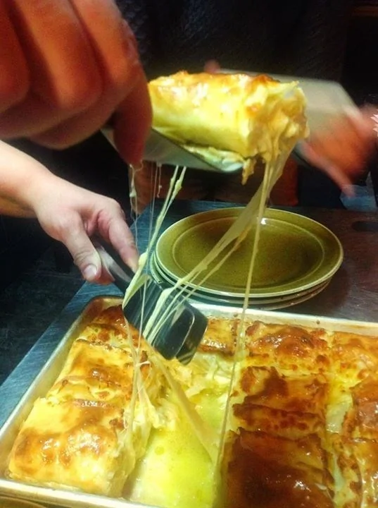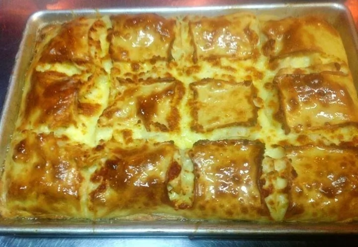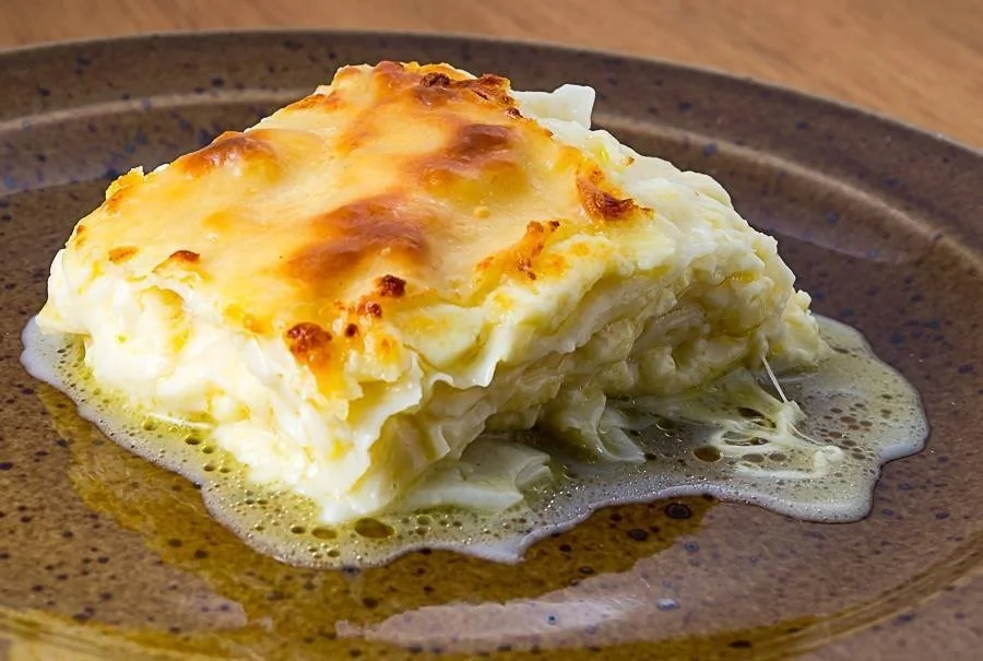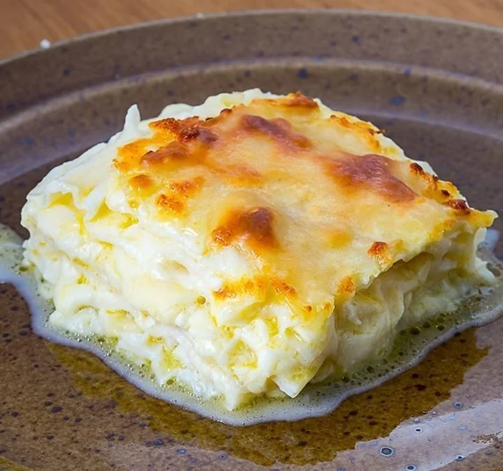 ШАГ 9 Смазываем первый слой растопленным маслом, накрываем вторым (заранее припущенным в кипятке слоем) и снова смазываем маслом. Сверху присыпаем натертым сыром, накрываем следующим отварным пластом теста, смазываем маслом и опять выкладываем сыр. Продолжаем с остальными слоями.