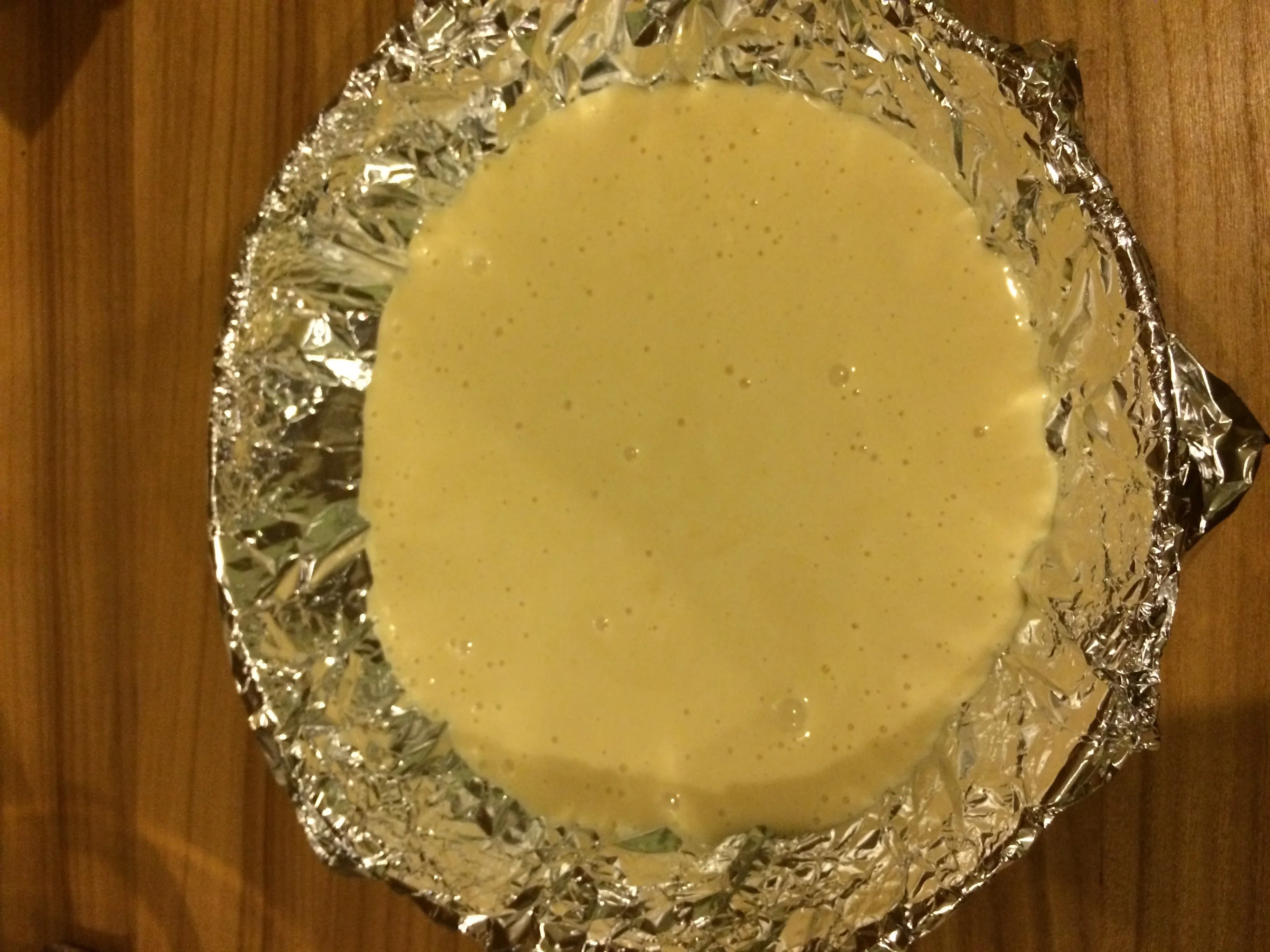ШАГ 9 Режем бананчик и раскладываем на дно формочки и заливаем тестом