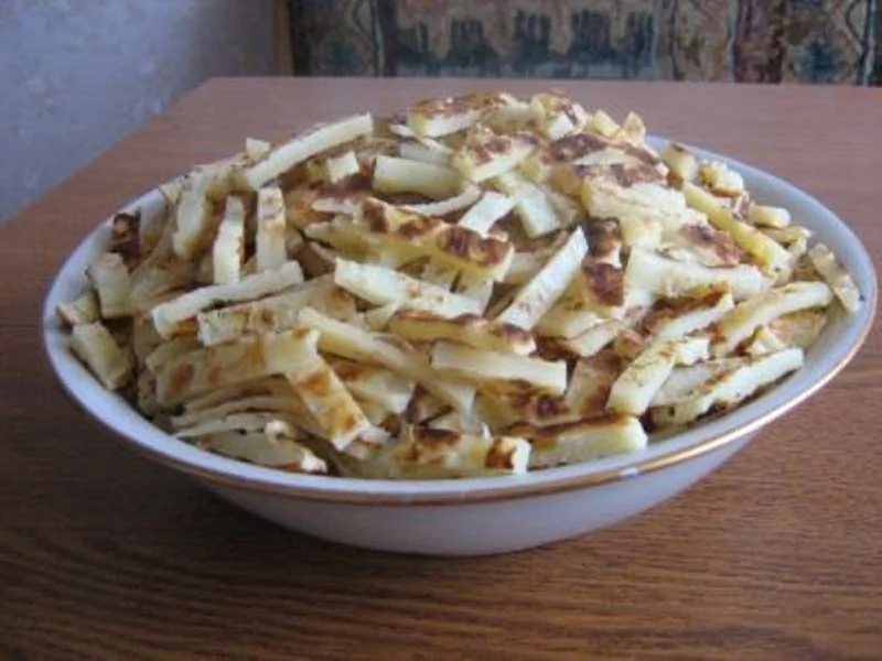 ШАГ 5 Потом готовые поостывшие блинчики нарезаем кубиками. Это лапша нашего лапшевника.